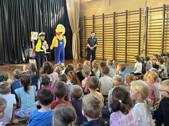 drugą stronę jezdni wraz z policją i maskotką mrówki.