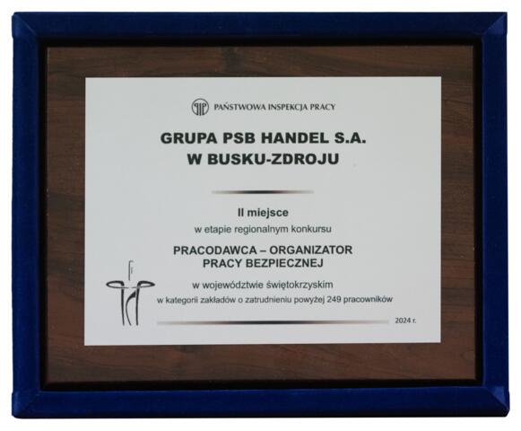 22 listopada 2024 r. w Filharmonii Świętokrzyskiej w Kielcach odbyło się uroczyste podsumowanie działań prewencyjnych organizowanych przez Okręgowy Inspektorat Pracy w Kielcach. W ramach wydarzenia Grupa PSB Handel S.A. zdobyła drugie miejsce w prestiżowym konkursie „Pracodawca – organizator pracy bezpiecznej”, w województwie świętokrzyskim w kategorii zakładów zatrudniających powyżej 249 pracowników.