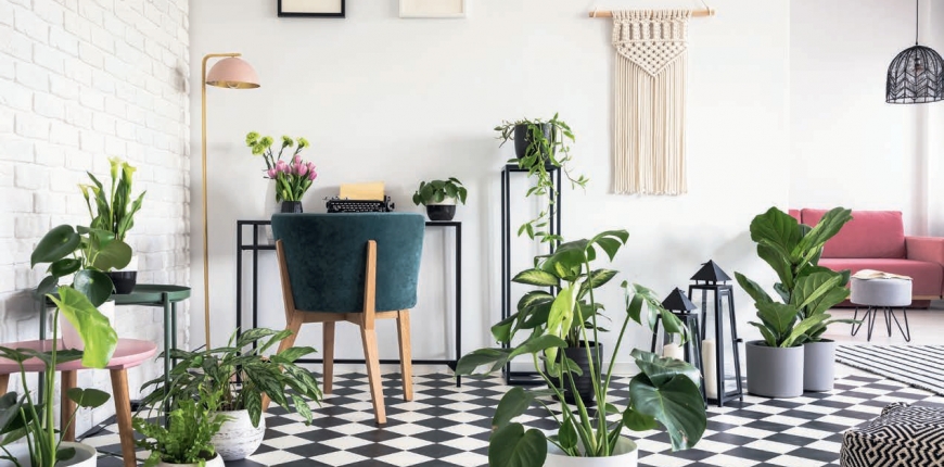 Aby rośliny mogły swobodnie rosnąć, należy zapewnić im dużo naturalnego światła. Istotna część trendu biofilii to otwarcie mieszkań i domów na światło, a  zarazem otoczenie poprzez tradycyjne okna, ale też nietypowe przeszklenia. Dodatkowym atutem dużych okien jest również to, że wizualnie łączą one ogród z  częścią mieszkalną, pozwalając na wnikanie zieleni do wnętrz. Żywe okazy roślinne można dzisiaj wprowadzać do pomieszczeń na wiele sposobów –  kwiaty doniczkowe mogą jak dawniej wypełniać parapety, ale też swobodnie stać w  olbrzymich donicach na podłodze, zwisać z sufitu, piąć się po ścianach pomieszczeń i ściankach ustawionych jako podpory. Czy powinniśmy im jednak pozwolić na ekspansję bez ograniczeń? Jak wdrażać zieleń do wnętrz, by zachowała swój walor dekoracyjny, ale by zarazem nie zdominowała naszego życia? Zwróćmy uwagę, że trend biofilia nie zachęca do wprowadzania roślin bez ograniczeń. Bycie częścią dżungli jest tylko wtedy korzystne, jeśli roślinność jest stosowana z umiarem i  nie ogranicza funkcjonalności mieszkania. We wnętrzu warto wyznaczyć im jedno miejsce – do łask wracają kwietniki i  meble tak skonstruowane, by w  całości mogły wypełniać je donice z kwiatami. Stosujmy też zasadę trzymania się proporcji wielkości rośliny do powierzchni i wysokości wnętrza – na wyjątkowo okazałe okazy będziemy mogli sobie pozwolić w bardzo dużych i wysokich wnętrzach, w małych mieszkaniach ograniczmy się do gatunków, którym wystarczą małe doniczki.