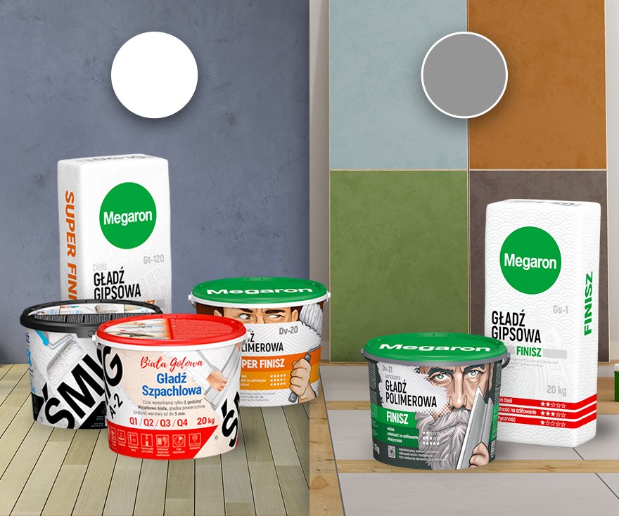 No ale dobra, trochę się rozpisaliśmy a w zasadzie pewnie interesuje was odpowiedź na pytanie czy lepiej użyć szarej czy białej gładzi? W tym przypadku jednak to nie dyscyplina olimpijska i ciężko wskazać jednoznacznie zwycięzcę. Oba rodzaje mają swoje zalety i dedykowane miejsca aplikacji, tak więc jest to sprawa nieoczywista i zależy głównie od preferencji użytkowników. Jeżeli zależy nam na śnieżnej bieli to polecamy szczególnie ŚMIG A-2, ŚMIG A-11 oraz Megaron Dv-20 i Megaron Gt-120. Jeżeli jednak biel nie jest konieczna i powierzchnia może być równie dobrze jasnoszara to zachęcamy do wypróbowania gotowego Megaron FINISZ Dv-21 oraz sypkiego Megaron FINISZ Gs-1.