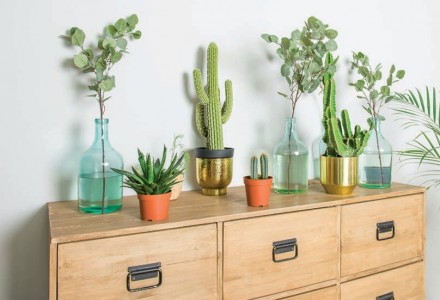 Niektóre odmiany dzięki kolcom mogą przypominać nawet kosmaty pompon jak np. Oreocereus. Przy odpowiedniej pielęgnacji kaktusy te odwdzięczą się nam dodatkowo niezwykle efektownym kwitnieniem – drobniutkimi tworzącymi wianuszek kwiatkami jak u Mamilarii czy ogromnymi przypominającymi anielskie trąby u Gymnokalicji. Bardzo atrakcyjny efekt mogą zapewnić odpowiednio wyeksponowane kaktusy o budowie kolumnowej, tworzące rozgałęzienia i rozrastające się intensywniej niż ich wspomniani kuliści krewniacy. Chociaż najciekawiej prezentują się pojedynczo wyeksponowane egzemplarze, to z ich wykorzystaniem możemy także zaproponować modną ekspozycję. Odmiany kaktusów kolumnowych jak np. Cereusy (popularnie zwane pałczakami) w  tym szczególnie popularny peruwiański, opuncja figowa, Myrtillocactus ze względu na rozgałęzioną budowę będą wymagały nieco większej przestrzeni i  najlepiej odsłoniętej płaszczyzny, by odpowiednio je wyeksponować. Kaktusy wyglądają najbardziej efektownie w zestawieniach o prostym surowym charakterze. Dlatego ładnie prezentują się w zwykłych ceramicznych doniczkach, w astetycznych betonowych pojemnikach lub w przeźroczystym szkle. Kaktusy są wdzięczne również w kompozycjach, które imitują ogrody skalne. Wyglądają efektownie sadzone w grupach w towarzystwie innych sukulentów.