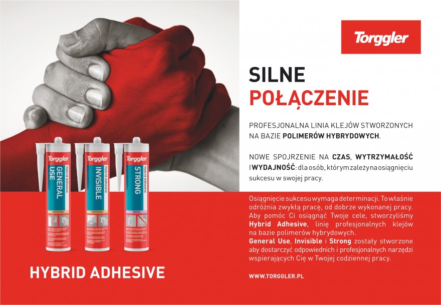 Klej Hybrid Adhesive STRONG to uniwersalny materiał do klejenia różnych chłonnych i niechłonnych materiałów budowlanych jak beton, cegła, powierzchnie emaliowane i ceramiczne, szyby szklane, lustra, PCW, twarde tworzywa sztuczne (HPL), metale (miedź, cynk, aluminium, stopy metali, stal nierdzewna), płyty gipsowo-kartonowe, płyty cementowo-wiórowe i drewniane. Produkt ten nie wymaga stosowania podparć montażowych na czas wiązania kleju, wykazuje przyczepność również w warunkach wysokiej wilgotności, nie kurczy się, nie pęcznieje w czasie wiązania, a po związaniu charakteryzuje się wysokim modułem sprężystości. Można go stosować na wilgotnych podłożach, a także na podłożach narażonych na wibracje. Nie zawiera izocyjanianów, rozpuszczalników i silikonów, nie wywołuje korozji metali, nie ma nieprzyjemnego zapachu. Związany materiał można malować.