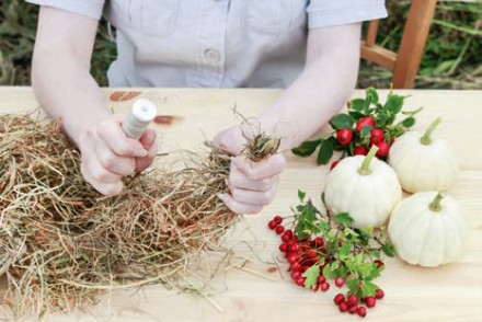 6. Wybieramy fragment, który będziemy dekorować ozdobnymi, jesiennymi owocami (najlepiej maskując miejsce łączenia) i wplatamy weń poszczególne gałązki, oplatając oraz podwiązując je nicią.
