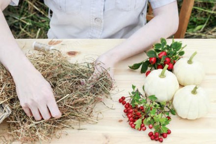 1. Do przygotowania tej minimalistycznej, ale jakże sielskiej dekoracji potrzebne będą: nić pasmanteryjna lub florystyczna w kolorze jak najbardziej zbliżonym do przygotowanej przez nas wiązki suchej trawy (może być szara, écru, beżowa lub seledynowa); gałązki jesiennych owoców: dzika róża, kalina, głóg, jarzębina, dziurawiec, miechunka itp.; niewielkie ozdobne dynie lub tykwy w dowolnie wybranym kolorze; nieduży snopek suchej trawy o wytrzymałej niełamiącej się strukturze, np. suszona trawa morska.