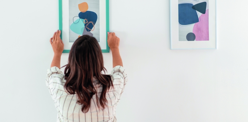 Zanim powiesimy obrazy czy plakaty, warto poznać kilka zasad. Znaczenie ma wielkość obrazu, dostępna powierzchnia ściany i jej otoczenie. Jeśli obraz ma być widoczny, powinien znajdować się na wysokości naszych oczu. Centralny punkt obrazu lub kompozycji umieszcza się na wysokości około 150-160 cm. Pojedynczy obraz powinien mieć wolną przestrzeń wokół siebie. Wyzwaniem może być zawieszenie kilku obrazów na jednej ścianie. Kompozycję tworzymy z tych o podobnej wielkości. Jeśli mamy bardzo duży obraz o przyciągających uwagę kolorach, nie powinien on być zawieszony razem z miniaturami – najlepiej je rozdzielić. Jeżeli jednak nie ma takiej możliwości, warto zastosować się do jednego z trzech układów. Pierwszy to zawieszenie obrazów w linii prostej z największym w centrum i coraz mniejszymi w kierunkach zewnętrznych. W drugiej wersji tworzymy układ, w którym największy obraz stanowi szczytowy punkt, a mniejsze umieszczone są ukośnie ku dołowi z niewielkim nachyleniem linii bocznych. Można też zawiesić obrazy w układzie kwadratowym, gdzie największy z nich stanowi punkt centralny, a mniejsze są podkreśleniem narożników. Jeśli obraz wieszamy nad meblem, kierujmy się zasadą 2/3. Jej istotą jest takie wieszanie obrazu, aby wolna przestrzeń ściany pomiędzy jego dolną krawędzią i meblem wynosiła mniej więcej 2/3 wielkości płótna. Obraz nie może też być szerszy niż mebel, a jeśli na tym ostatnim stoją jakieś bibeloty, wazoniki, zegarek, fotografie, to nie mogą one zasłaniać krawędzi płótna. Idealna odległość to około 20-30 cm od krawędzi mebla.